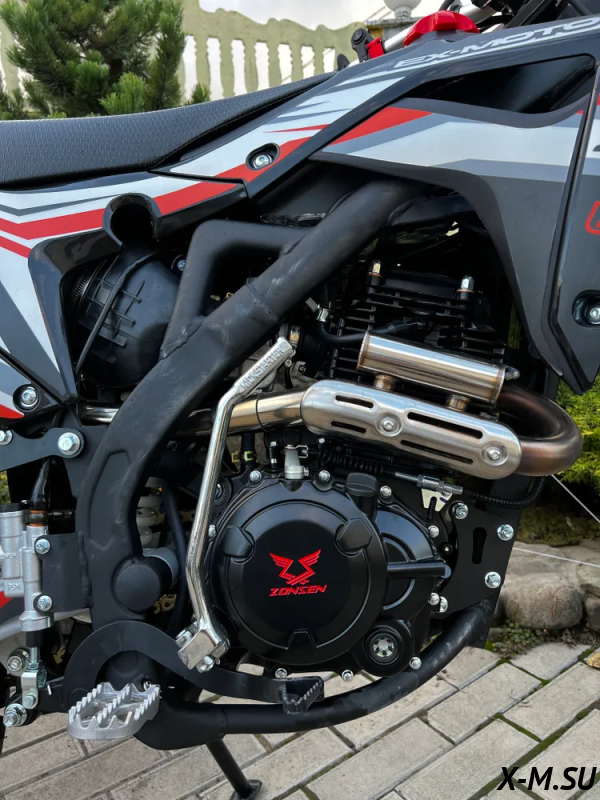 Оснащается Топовым оригинальным ZS 177FMN с высоким крутящим моментом в паре со спортивным карбюратором Nibbi Racing 30 идеально расположен внутри рамы. По сравнению с другими эндуро мотоциклами наклонен назад, это позволило распределить массу и получить лучшую управляемость.